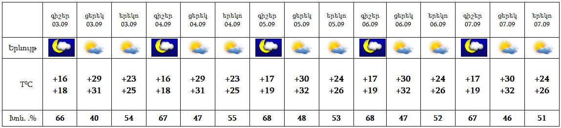 Սեպտեմբերի 3-7-ի երեկոյան ժամերին սպասվում է ամպրոպ և քամու ուժգնացում՝ 16-18 մ/վ արագությամբ, առանձին հատվածներում նաև կա կարճատև անձրևի հավանականություն: