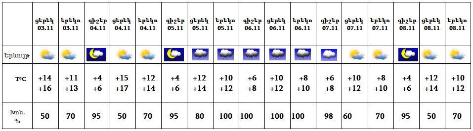 Երևան քաղաքում՝ նոյեմբերի 3-ի ցերեկը, 4-ին, 5-ի գիշերը, 7-8-ը սպասվում է առանց տեղումների եղանակ։ Նոյեմբերի 5-ի ցերեկը, 6-ին ժամանակ առ ժամանակ սպասվում է անձրև: