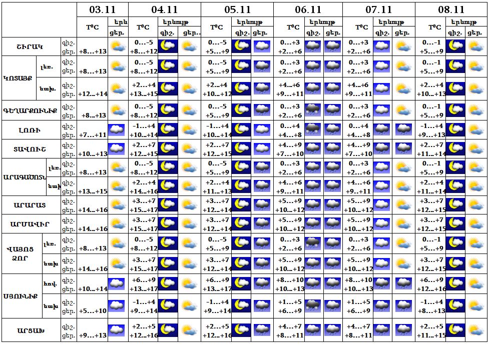 Հանրապետության տարածքում` նոյեմբերի 3-ի ցերեկը, 4-ին, 5-ի գիշերը, 8-ին սպասվում է առանց տեղումների եղանակ։ Նոյեմբերի 5-ի ցերեկը, 6-ին շրջանների զգալի մասում, 7-ին Լոռիում, Տավուշում, Սյունիքում և Արցախում սպասվում են տեղումներ, առանձին հատվածներում նաև մառախուղ։ Այս մասին հայտնում են ԱԻՆ-ից: